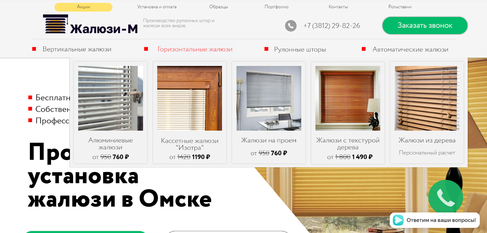 Также в шапку поместили ссылки на наиболее популярные виды жалюзи с открывающимся каталогом при наведении.