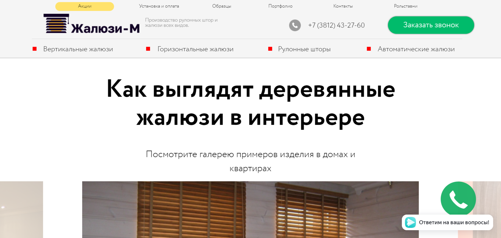 Создали отдельные страницы под каждую ассортиментную группу. На странице можно посмотреть палитру оттенков и заказать жалюзи определенного вида.
